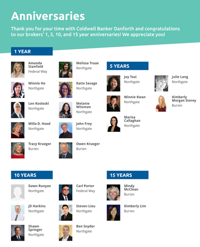 Thank you for the great service you provide to your clients and our communities. Happy anniversary to our long-term professional real estate brokers: